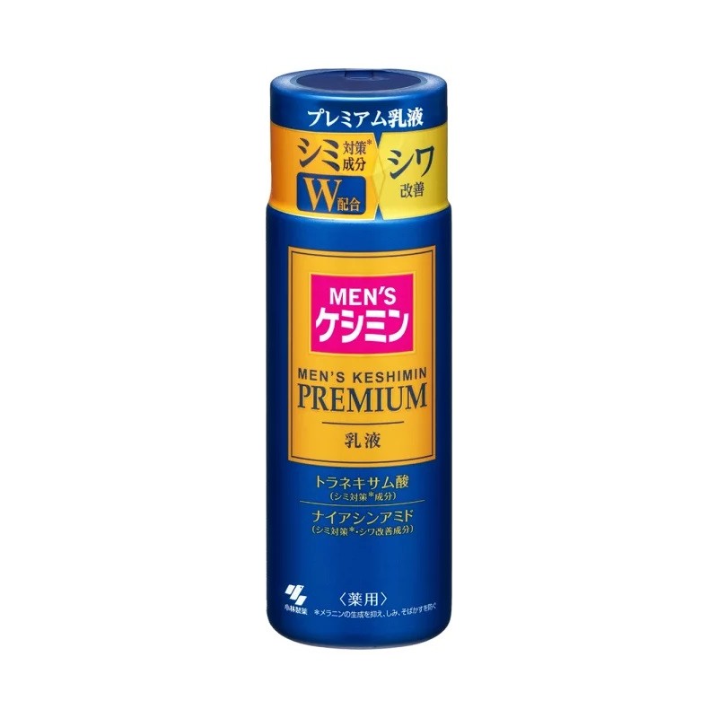 An intensive anti-spot and anti-wrinkle emulsion for men. Kobayashi Men's Keshimin Premium Emulsion is an advanced Japanese skincare emulsion designed for men's skin prone to discoloration, roughness, and loss of firmness. Enriched with a dual-active formula (W Formula) with tranexamic acid and niacinamide. 110ml