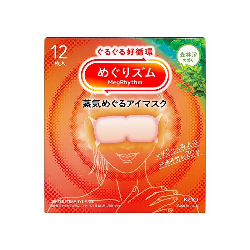 Thermal eye masks with a forest bathing scent. MegRhythm thermal eye masks (by Kao Corporation) are designed to soothe tired and puffy eyes, utilizing self-heating and light steam technology. 5, 12 masks