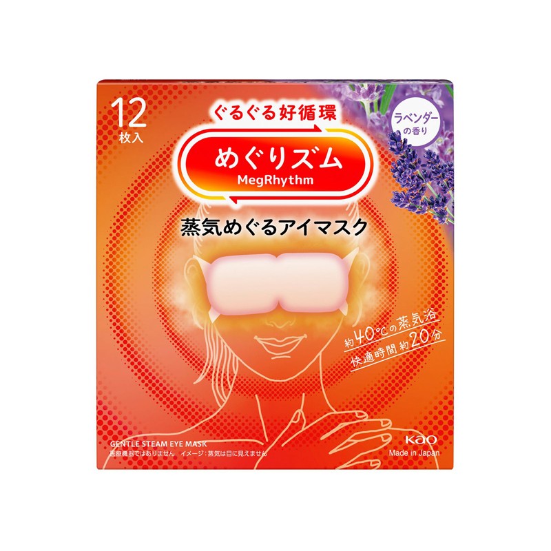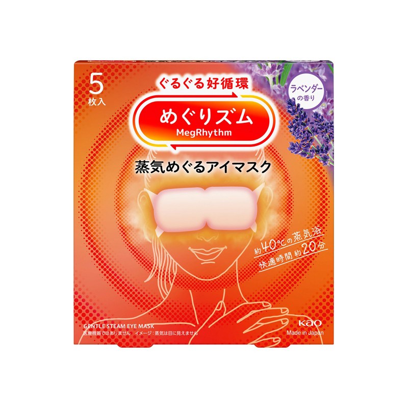 Lavender-scented steam eye masks. MegRhythm (Kao Corporation)'s relaxing eye mask, "Lavender Scent," is designed for tired, puffy eyes. Using innovative warm steam technology, it helps envelop the eye area in comfortable warmth. 5, 12 pieces