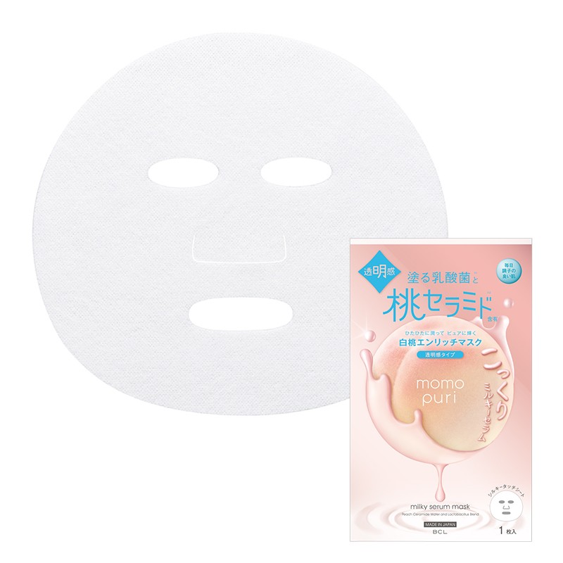 momo puri Enrich Clear Milky Serum Mask is a moisturizing peach ceramide- and priobiotic masks from the Japanese company BCL. Each mask is soaked in a rich milk serum, which provides intensive moisturizing of normal and dry skin, while improving its transparency. Momo Puri's characteristic blend of peach ceramics and Lactobacillus probiotic, strengthens the natural protective barrier and ensures skin firmness. Vitamins C, E, hyaluronic acid, bergamot extract and peach leaf extract (from peaches grown in Nagano) narrow the pores while nourishing the skin. After applying BCL momo puri Enrich Clear Milky Serum Mask the skin is visibly firmer, more supple and radiant. The masks have a delicate, beautiful scent of sweet peach. There are 4 masks in the package.