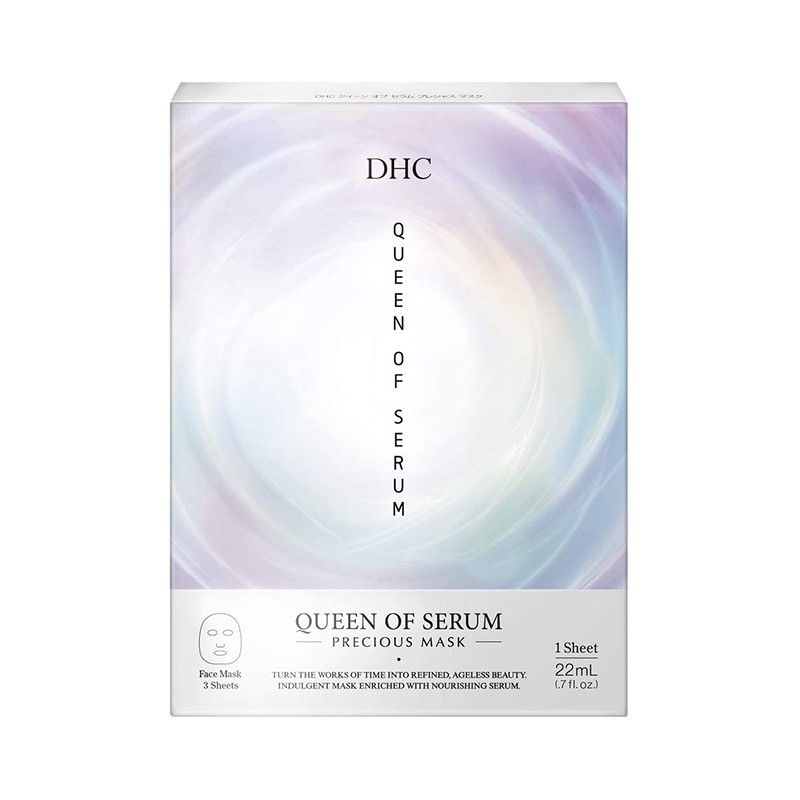Queen Of Serum Precious Mask is an anti-aging sheet mask by Japanese company DHC. Ideal for mature skin with visible signs of aging. These Asian luxury sheet masks intensively hydrate and regenerate the skin and add glow to it. They protect the skin from age-related damage and restore its original beauty. They contain the bestselling Queen of Serum for aging skin, which focuses on transforming time into beauty. The peptide (pentapeptide-48) nourishes the skin, improves moisture and elasticity levels, and makes aging skin look beautiful and youthful. The formula also contains royal jelly extract, hydrolyzed conchiolin protein, vitamin A (retinol) and 14 components of natural moisturizing factor (NMF) - essential ingredients for firm, supple and smooth skin. DHC Queen Of Serum Precious Masks also soothe and improve skin tone. They brighten the complexion and restore a healthy, youthful glow. DHC Queen Of Serum Precious Masks leave behind a radiant, beautiful complexion. They have a delicate, elegant floral fragrance. The product is free of dyes and parabens. Package contains 3 masks, each soaked with 22ml serum