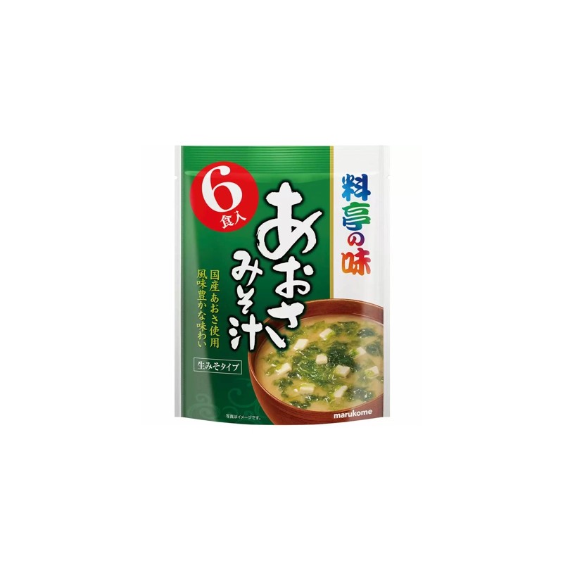 Ryouteino Aji Aosa Miso Soupe is a convenient to use natural Japanese miso soup with nori and tofu seaweed from Asian company Marukome-Kun. Miso soup is almost an obligatory part of Japanese lunch. It is usually served next to a traditional bowl of rice and consists of miso paste, dashi broth and additives. The package contains 6 sachets of instant miso soup (a combination of spicy miso paste and umami rich stock of bonito - dashi broth) and 6 sachets of dried blue-green nori seaweed and cut tofu. Simple high quality organic ingredients, an essential ingredient in Japanese cuisine. Add to your soups the distinct taste hidden in original healthy accessories straight from Japan!