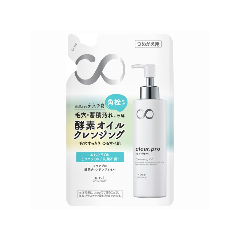 Softymo Clear Pro Cleansing Oil is an enzymatic facial makeup remover oil from the Japanese company Kose Cosmeport. Suitable for all skin types, including sensitive skin, Softymo Clear Pro Enzyme Cleansing Oil is a makeup remover oil based on the power of enzymes that effectively removes makeup, sebum, impurities, and dead skin cells, leaving the skin exceptionally smooth and cleansed. Thanks to proteolytic enzymes, the oil breaks down protein impurities and accumulated dirt in pores, helping to reduce blackheads and smooth the skin's texture.