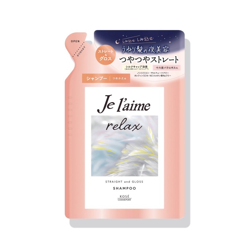 Je l'aime RELAX Straight and Gloss Shampoo is a smoothing night shampoo with a shine effect for frizzy and dull hair from the Japanese company Kose COSMEPORT. Je l’aime RELAX Straight and Gloss Shampoo is a luxurious shampoo for evening care of unruly, dry and dull hair, which tends to wave and frizz. Its advanced formula works intensively during sleep, restoring hair smoothness, elasticity and natural shine.