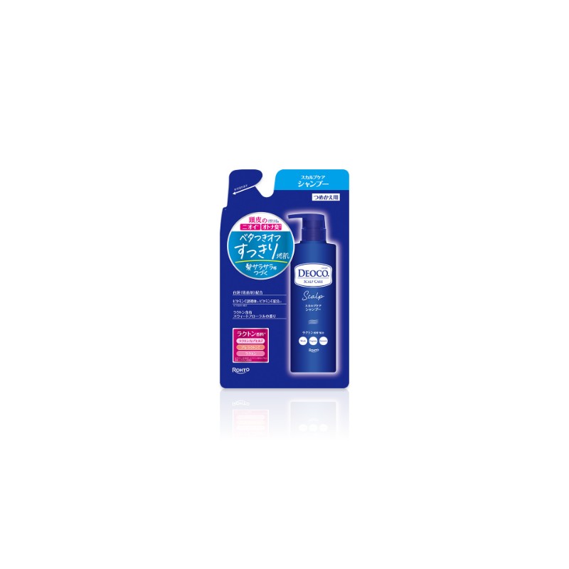 A scalp care shampoo with refreshing and odor-neutralizing properties. Rohto DEOCO Medicated Scalp Care Shampoo is a specialized scalp care shampoo that not only cleanses hair but also effectively eliminates unpleasant odors associated with sebum, sweat, and the so-called "mature skin odor." 450ml, 370ml