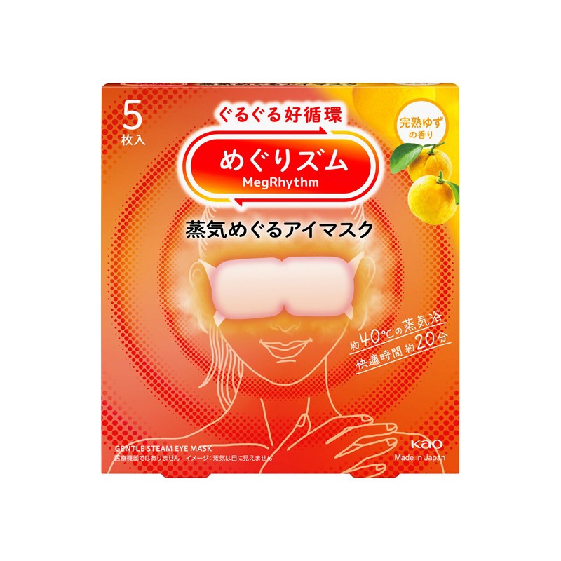 parowe maski na oczy o zapachu cytrusów yuzu. Maska na oczy z technologią parową marki MegRhythm (Kao Corporation) w wariancie o zapachu cytrusowej yuzu — stworzona, by przynieść ulgę zmęczonym i opuchniętym oczom oraz wspomóc relaks okolic oczu i twarzy. 5, 12 masek