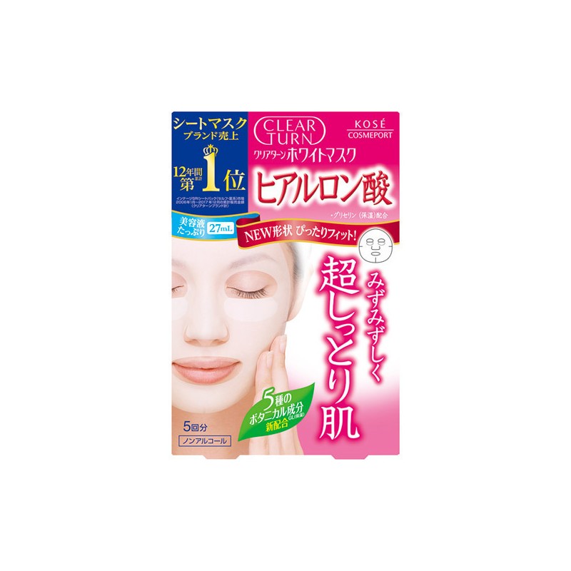 Clear Turn White Mask Hyaluronic Acid to zestaw 5 głęboko nawilżających maseczek w płachcie z kwasem hialuronowym japońskiej firmy Kose Cosmeport. Polecany do pielęgnacji skóry odwodnionej, wiotkiej i przesuszonej. W skład maseczki wchodzi kwas hialuronowy, gliceryna i prowitamina B5. Maseczki skutecznie poprawiają nawilżenie, nawodnienie i ujędrnienie skóry. Chronią przed utratą wody, zapobiegają destrukcji włókien kolagenowych i powstawaniu zmarszczek. Wygładzają, uelastyczniają skórę oraz działają regeneracyjnie i przeciwstarzeniowo. Nadają uczucie komfortu, świeżości i sprężystości. Prowitamina B5 (pantenol) o właściwościach przeciwzapalnych i antybakteryjnych łagodzi podrażnienia oraz przyspiesza gojenie ran i drobnych uszkodzeń skóry. Płachty wykonane są z 100% naturalnych opatentowanych bawełnianych materiałów (BEMLIESE®), które perfekcyjnie przylegają do skóry i zapewniają pełną absorpcję składników aktywnych. Maseczki są bezzapachowe, nie zawierają alkoholu, barwników, oleju mineralnego . W opakowaniu znajduje się 5 sztuk nasączonych serum o pojemności 22ml.