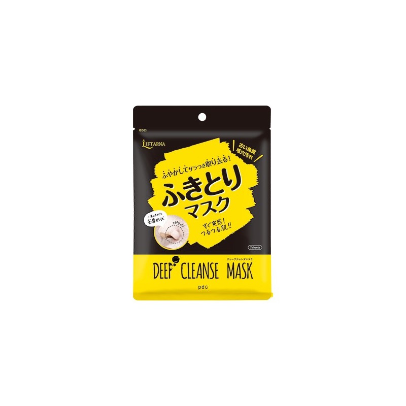 Deep Cleanse Mask to zestaw 7 głęboko oczyszczających, złuszczających masek płachtowych z kwasami AHA i BHA japońskiej firmy pdc Liftarna. Formuła zawiera między innymi kwas jabłkowy, kwas salicylowy, ekstrakt z karczocha, arbutynę, kwas hialuronowy, kolagen, skwalan, witaminę C, wyciąg z krwawnika pospolitego, ekstrakt z rumianku, wodę różaną, ekstrakt z pięciornika, kwas glicyryzynowy, glicerynę tokoferol (witamina E). Maseczka złuszczająca oczyszcza skórę do głębi porów, dokładnie usuwa martwy naskórek, nadmiar sebum oraz zanieczyszczenia. Jednocześnie pielęgnuje skórę, nawilża i odżywia. Zwęża rozszerzone pory, koi i łagodzi podrażnienia oraz przywraca skórze świeżość i blask. Po zastosowaniu skóra jest czysta, aksamitnie gładka i promienna. Maseczka wykonana jest z miękkiego arkusza celulozowego, który idealnie przylega do naturalnych konturów twarzy, a zwłaszcza skrzydełek nosa, aby dokładnie wyciągnąć zanieczyszczenia. Opakowanie zawiera 7 sztuk masek.
