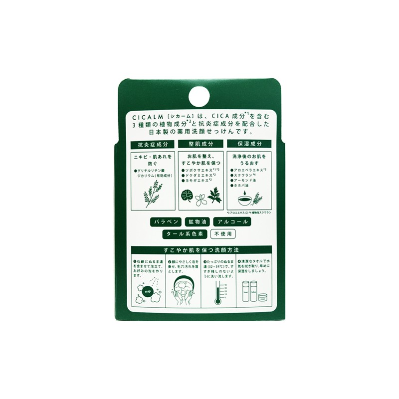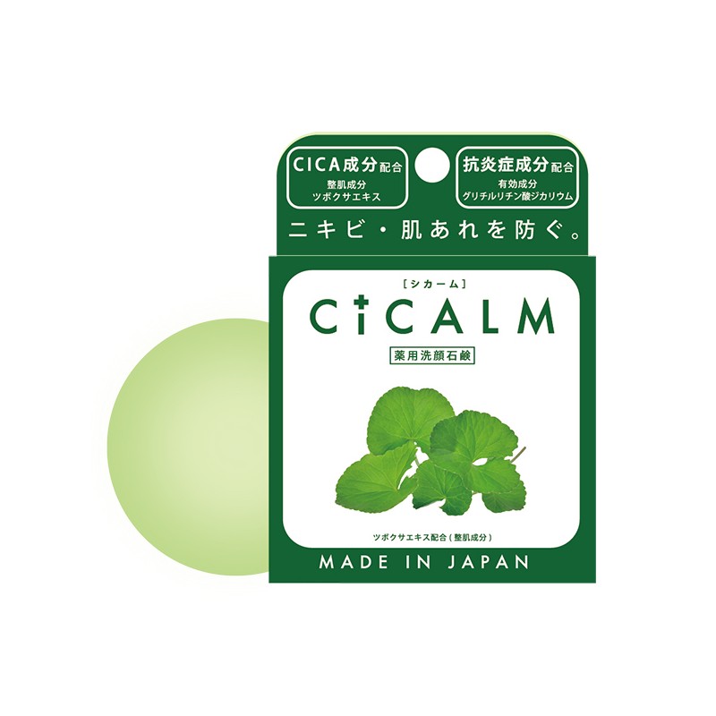 CICALM SOAP to mydło do twarzy z wąkrotką azjatycką zapobiegające powstawaniu wyprysków i szorstkości skóry japońskiej firmy Pelican. Może być używane do mycia twarzy jak i ciała. Mydło z wąkrotką azjatycką doskonale oczyszcza i pielęgnuje skórę twarzy. Nawilżająca formuła pielęgnacyjna bogata w cenne składniki zapobiega powstawaniu niedoskonałości oraz sprawia, że przesuszone partie skóry znów stają się miękkie i delikatne. 3 rodzaje ekstraktów roślinnych, w tym CICA i 4 rodzaje składników nawilżających pochodzenia roślinnego zapewniają nawilżoną i zdrową skórę. Wyjątkowa formuła zawiera także pstrolistkę sercowatą, ekstrakt z bylicy pospolitej, aloes, skwalan olej migdałowy i jojoba. Wąkrota azjatycka (CICA) ma działanie: