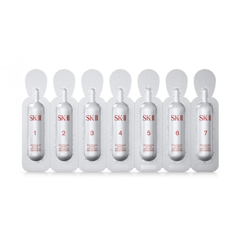 Whitening Spot Specialist Concentrate to silnie rozjaśniający przebarwienia koncentrat wybielający w ampułkach japońskiej, luksusowej firmy SK-II. To najbardziej intensywny zabieg nocnego wybielania skóry SK-II. Formuła oparta na rewolucyjnym kompleksie wybielającym “Rich Melano Discharge” z opatentowanym składnikiem Pitera ™ ( bio-składnik pochodzący z fermentacji drożdżowej, który przypomina naturalne czynniki nawilżające skórę. Zawiera ponad 50 mikroelementów, w tym: witaminy, minerały, aminokwasy i kwasy organiczne, które warunkują naturalne funkcje skóry) redukuje te nawet najtrudniesze do usunięcie plamy i przebarwienia, rozjaśnia cerę i normalizuje jej koloryt. Już po 4 tygodniach najbardziej uporczywe, ciemne plamy, są wyraźnie zmniejszone, a cera staje się zdecydowanie jaśniejsza i przejrzysta. Opakowanie zawiera 28 ampułek.