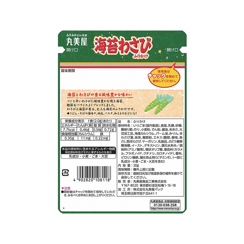 Wykaz składników: Roasted Sesame Seeds (Domestically Produced), Salt, Lactose, Sugar, Shaved Bonito Flakes, Seaweed, Wheat Flour, Starch, Soy Sauce, Green Laver, Processed Soy Products, Processed Oils and Fats, Seaweed Calcium, Real Wasabi Stem, Mirin, Matcha, Dried Bonito Powder, Extract (Dried Bonito, Yeast, Seafood), Horseradish, Dairy Products, Glucose-Fructose Liquid Sugar, Yeast, Dextrin, Reduced Starch Syrup、seasonings (Amino Acids, Etc.), Cyclic Oligosaccharides, Colorings (Caramel, Flavonoids, Gardenia, Carotenoids), Flavorings, Iron Pyrophosphate, Antioxidants (Vitamin E), (Contains Dairy Products, Wheat, Sesame, Soy).