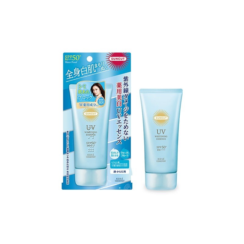 SUNCUT Whitening UV Essence SPF50+ PA++++ to wodoodporny, rozjaśniający krem przeciwsłoneczny do twarzy i ciała z witaminą C japońskiej firmy Kose Cosmeport. Krem zapewnia wysoką i długotrwałą ochronę przed szkodliwym działaniem promieni UVB i UVA, jednocześnie zapobiegając powstawaniu ciemnych plam. Mieszanka pochodnej witaminy C, glicyretynianu stearylu, kwasu hialuronowgo, ekstraktu z łzawnicy ogrodowej (tzw łzy Hioba) oraz 10 nawilżających ekstraktów roślinnych naturalnie poprawia koloryt, rozjaśnia, pielęgnuje i chroni skórę przed wysuszeniem. AllerGuard firmy Suncut zapobiega przyleganiu do skóry pyłków, kurzu i innych szkodliwych czynników środowiskowych. Krem chroni skórę przed uszkodzeniami promieniami UV i suchością, jednocześnie poprawiając przejrzystość cery. Hamuje tworzenie się melaniny, redukuje i zapobiega powstawaniu przebarwień. Jest idealny do codziennego użytku, na plażę jak i dla miłośników aktywnego wypoczynku i sportu. Może być stosowany jako baza pod makijaż. Formuła odporna na działanie wody i potu. Pojemność 80g.