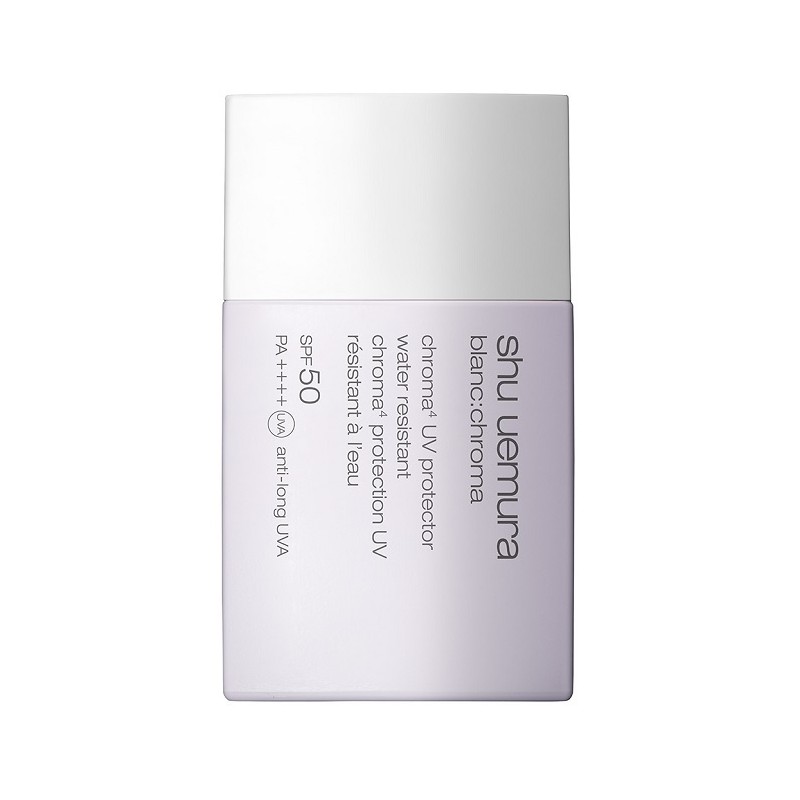 Blanc Chroma UV Protector Water Resistant SPF50 PA++++ to rozjaśniająco - rozświetlający krem przeciwsłoneczny do twarzy japońskiej firmy Shu Uemura. Idealny dla osób borykających się z plamami, przebarwieniami, zaczerwienieniami, nierównym, szarawym, ziemistym kolorytem cery. Formuła odporna na wodę. Ten luksusowy, azjatycki krem przeciwsłoneczny do twarzy silnie i długotrwale chroni skórę przed szkodliwym działaniem promieni UV, jednocześnie korygując jej koloryt. Przywraca skórze twarzy naturalną jasność, przejrzystość i świeżość. Ujednolica i naturalnie wyrównuje koloryt. Niweluje ciemne plamy, zaczerwienienia, zielonkawo ziemiste i żółtawe zabarwienie skóry. Doskonale nawilża i odżywia . Shu Uemura Blanc Chroma UV Protector Water Resistant SPF50 PA++++ redukuje 4 niepożądane barwy i sprawia, że skóra jest zabezpieczona przed ostrym słońcem i staje się jednolita, jasna, gładka i promienna. Cera wygląda młodo, zdrowo i świeżo. Pojemność 40ml.