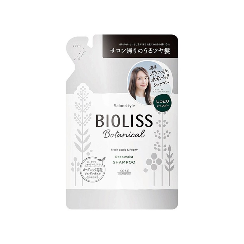 Botanical Hair Shampoo Deep Moist to głęboko nawilżający szampon botaniczny japońskiej firmy Kose SS Bioliss. Idealny do suchych włosów. Ten botaniczny szampon o działaniu nawilżającym zawiera bogate składniki roślinne, które zapewniają lśniące, zdrowe włosy. Delikatnie ale skutecznie oczyszcza skórę głowy oraz kosmyki. Nawilża i uelastycznia włosy oraz daje im piękny połysk. Zawiera między innymi olej arganowy, ekstrakt z korzenia altei, ekstrakt z owoców kopru włoskiego, oliwę z oliwek, ekstrakt z owoców dzikiej róży, ekstrakt z kory brzozy, miętę pieprzową, ekstrakt z kwiatu nagietka lekarskiego, kwas hialuronowy, ekstrakt z liści jojoby, ekstrakt z lawendy, olej z otrębów ryżowych. Szampon ma przyjemny zapach jabłek i piwonii, który emanuje świeżością. Pojemność do wyboru: 480ml lub uzupełnienie 340ml.
