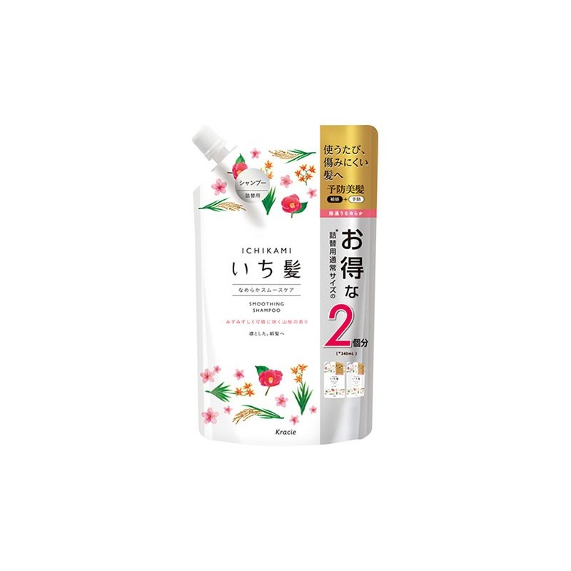 Smoothing Shampoo to wielokrotnie nagradzany (m.in. Ray 2014, SEDA) wygładzająco - regenerujący szampon japońskiej firmy Kracie Ichikami. Przeznaczony do włosów suchych, matowych, zniszczonych zabiegami fryzjerskim. Oprócz oczyszczania ma działanie wygładzające, zapobiega przed wysuszaniem włosów niezdyscyplinowanych, ułatwia rozczesywanie i układanie, regeneruje, odżywia i nawilża. Zapobiega skręcaniu się włosów i puszeniu. Formuła szamponu oparta jest na wielu naturalnych składnikach. Zawiera między innymi: ekstrakt z nasion kamelii japońskiej, olej z kiełków ryżu, ekstrakt z liści drzewa wiśniowego, wyciąg z korzeni rośliny belamcanda chinensis, wyciąg z fasoli Adzuki i wyciąg mydlińca właściwego /zawierają saponiny, które mają właściwości detergentów bez właściwości uczulających/. Po zastosowaniu włosy są zregenerowane, odżywione, miękkie, gładkie, lśniące, jedwabiste, pełne blasku. Włosy łatwiej się rozczesują, a włókno włosa zostaje odbudowane i wygładzone. Ma piękny, delikatny aromat wiśni. Nie zawiera siarczanów. Pojemność do wyboru: 480ml lub uzupełnienie 340ml lub uzupełnienie 680ml.